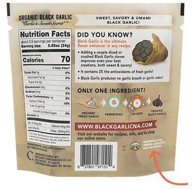 Unlike our peeled and diced cloves, our Whole Bulbs of Black Garlic do not need to be refrigerated. Though they can be stored in the fridge, Whole Bulbs are at their best if left out of the package. Like wine in a carafe, Whole Bulbs should be allowed to breathe. We recommend keeping two bulbs outside of the package at a time, while keeping the rest of the bulbs inside the package and rotating them out of the pack as used. Whole Bulbs have a natural casing and will prevent a black garlic scent in your kitchen.